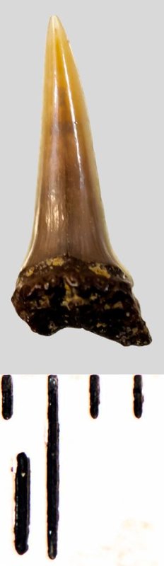 Зуб. Акула. Eostriatolamia subulata (Agassiz, 1843). Классификация: Хордовые Chordata, Позвоночные Vertebrata, Хрящевые рыбы Chondrichthyes, Пластиножаберные Elasmobranchii, Акулы Selachii, Ламнообразные Lamniformes, Песчаные акулы Odontaspididae