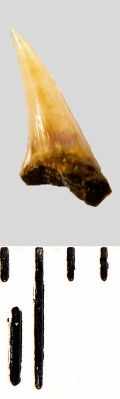 Зуб. Акула. Eostriatolamia subulata (Agassiz, 1843). Классификация: Хордовые Chordata, Позвоночные Vertebrata, Хрящевые рыбы Chondrichthyes, Пластиножаберные Elasmobranchii, Акулы Selachii, Ламнообразные Lamniformes, Песчаные акулы Odontaspididae