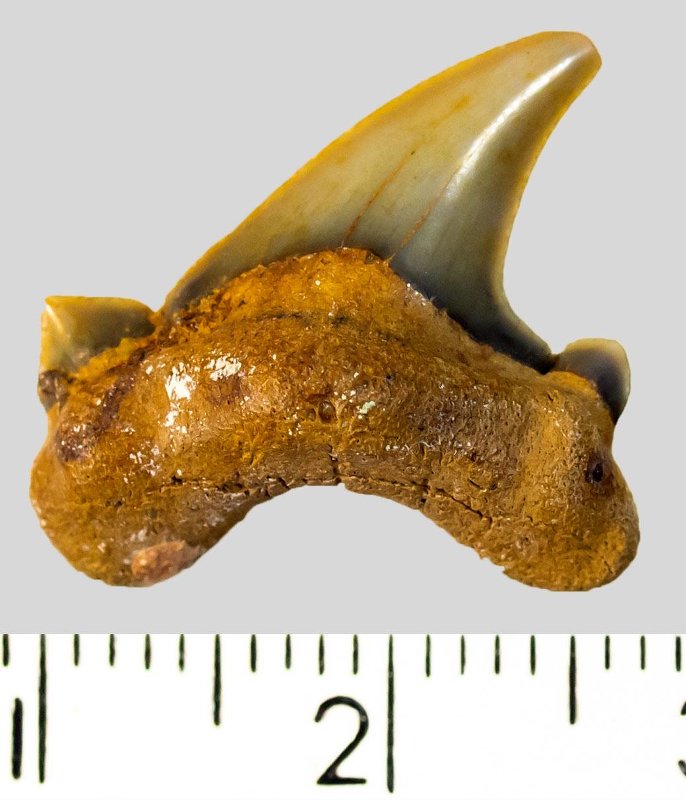 Крупный задний зуб с коронкой желтовато-серого цвета, режущего типа, без скульптуры, с гладким режущим краем. Корень охристый, арочный, умеренно массивный, с выступающим протуберанцем и широкими ветвями. Имеется одно питательное отверстие с лингвальной стороны корня. Присутствует пара широких режущих добавочных зубцов коронки.
