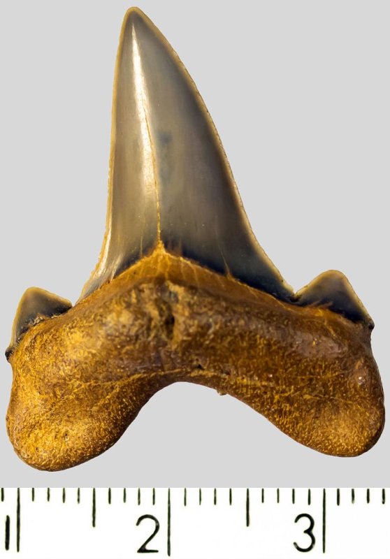 Крупный боковой зуб с коронкой темно-серого цвета, режущего типа, без скульптуры, с гладким режущим краем. Корень охристый, арочный, умеренно массивный, с широкими ветвями. Имеется одно питательное отверстие с лингвальной стороны корня. Присутствует пара широких режущих добавочных зубцов коронки.