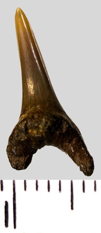 Передний зуб коричневого цвета с высокой, узкой коронкой колюще-режущего типа. Коронка S-образно изогнута, с гладким режущим краем. С лингвальной стороны у основания коронки на эмали имеется скульптура в виде слабой продольной струйчатости. Корень бурый, арочный, умеренно массивный, со следами окатанности. Имеется питательная щель. Боковые зубцы отсутствуют.