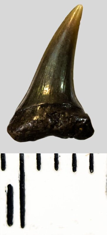 Коронка мелкого бокового зуба охристо-бурого цвета, режущего типа, S-образно изогнутая, с гладким режущим краем. Корень бурый, сильно окатанный, сохранился фрагментарно.