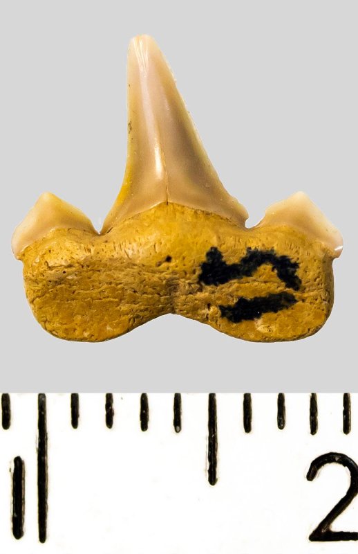 Средних размеров задний зуб с коронкой светло-бежевого цвета, режущего типа, без скульптуры, с гладким режущим краем. Корень серо-охристый, арочный, умеренно массивный, с широкими, субпрямоугольными ветвями и U-образным вырезом между ними, со следами окатанности. С лингвальной стороны корня питательное отверстие. Имеется одна пара широких режущих добавочных зубцов коронки.