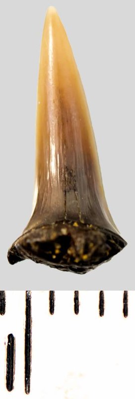 Коронка мелкого бокового зуба коричневого цвета, колюще-режущего типа, S-образно изогнутой, с гладким режущим краем. С лингвальной стороны у основания коронки на эмали имеется скульптура в виде слабой продольной струйчатости. Корень бурый, сохранился фрагментарно.