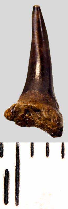 Коронка мелкого бокового зуба коричневого цвета, колюще-режущего типа, S-образно изогнутой, с гладким режущим краем. С лингвальной стороны у основания коронки на эмали имеется скульптура в виде слабой продольной струйчатости. Корень бурый, сохранился фрагментарно.