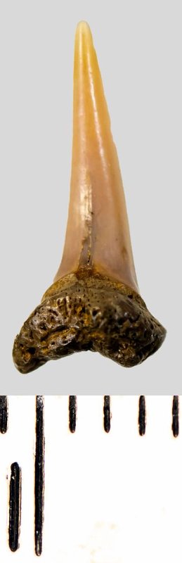 Зуб. Акула. Eostriatolamia subulata (Agassiz, 1843). Классификация: Хордовые Chordata, Позвоночные Vertebrata, Хрящевые рыбы Chondrichthyes, Пластиножаберные Elasmobranchii, Акулы Selachii, Ламнообразные Lamniformes, Песчаные акулы Odontaspididae
