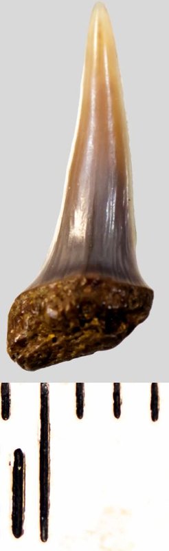 Зуб. Акула. Eostriatolamia subulata (Agassiz, 1843). Классификация: Хордовые Chordata, Позвоночные Vertebrata, Хрящевые рыбы Chondrichthyes, Пластиножаберные Elasmobranchii, Акулы Selachii, Ламнообразные Lamniformes, Песчаные акулы Odontaspididae
