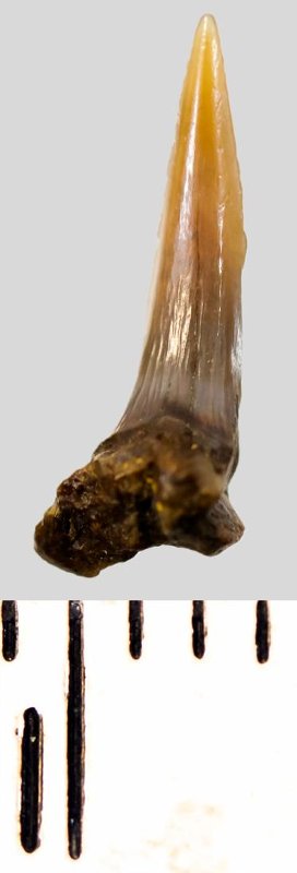 Зуб. Акула. Eostriatolamia subulata (Agassiz, 1843). Классификация: Хордовые Chordata, Позвоночные Vertebrata, Хрящевые рыбы Chondrichthyes, Пластиножаберные Elasmobranchii, Акулы Selachii, Ламнообразные Lamniformes, Песчаные акулы Odontaspididae