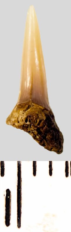 Зуб. Акула. Eostriatolamia subulata (Agassiz, 1843). Классификация: Хордовые Chordata, Позвоночные Vertebrata, Хрящевые рыбы Chondrichthyes, Пластиножаберные Elasmobranchii, Акулы Selachii, Ламнообразные Lamniformes, Песчаные акулы Odontaspididae