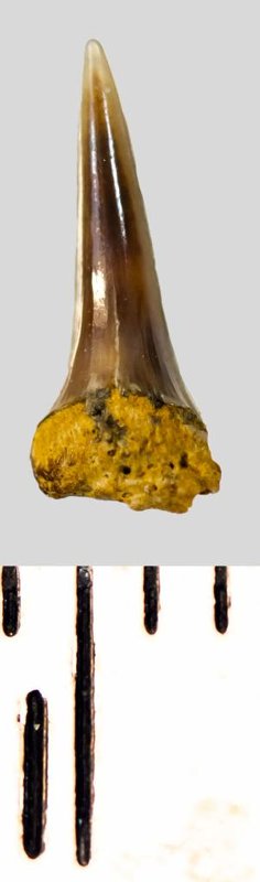 Зуб. Акула. Eostriatolamia subulata (Agassiz, 1843). Классификация: Хордовые Chordata, Позвоночные Vertebrata, Хрящевые рыбы Chondrichthyes, Пластиножаберные Elasmobranchii, Акулы Selachii, Ламнообразные Lamniformes, Песчаные акулы Odontaspididae
