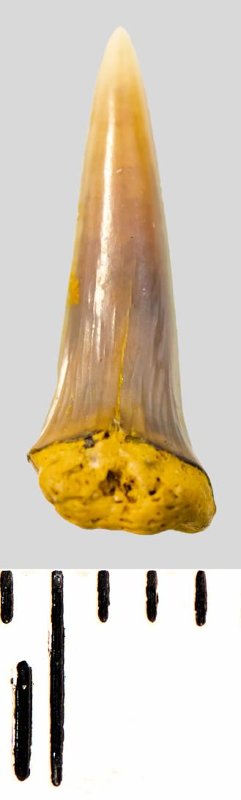 Зуб. Акула. Eostriatolamia subulata (Agassiz, 1843). Классификация: Хордовые Chordata, Позвоночные Vertebrata, Хрящевые рыбы Chondrichthyes, Пластиножаберные Elasmobranchii, Акулы Selachii, Ламнообразные Lamniformes, Песчаные акулы Odontaspididae