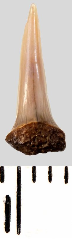 Зуб. Акула. Eostriatolamia subulata (Agassiz, 1843). Классификация: Хордовые Chordata, Позвоночные Vertebrata, Хрящевые рыбы Chondrichthyes, Пластиножаберные Elasmobranchii, Акулы Selachii, Ламнообразные Lamniformes, Песчаные акулы Odontaspididae