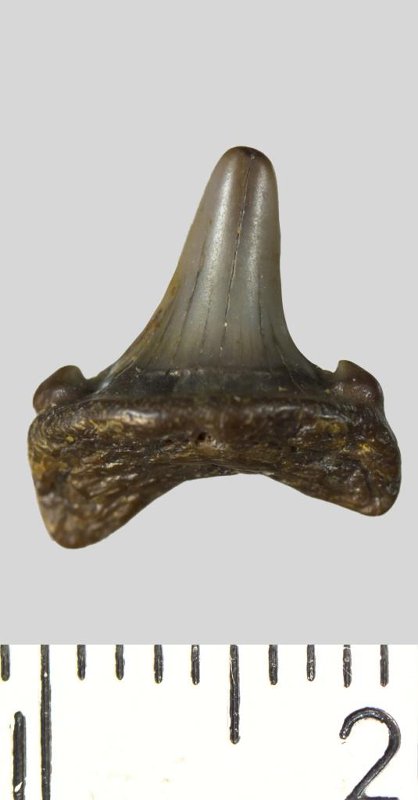 Зуб. Акула. Scapanorhynchus sp. Классификация: Хордовые Chordata, Позвоночные Vertebrata, Хрящевые рыбы Chondrichthyes, Пластиножаберные Elasmobranchii