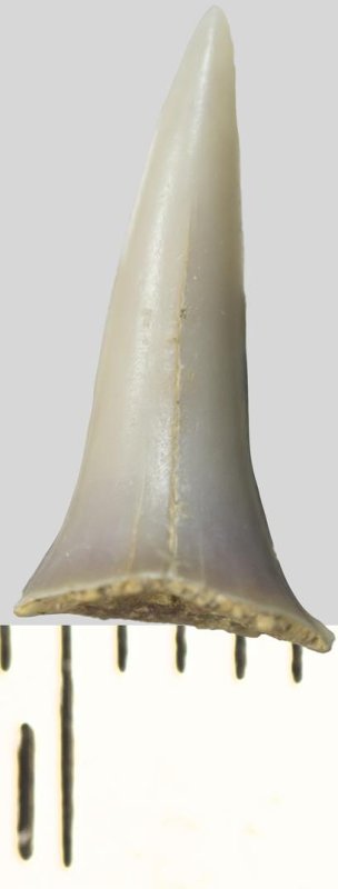 Зуб (фрагмент). Акула. Odontaspis venusta (Leriche, 1929). Классификация: Хордовые Chordata, Позвоночные Vertebrata, Хрящевые рыбы Chondrichthyes, Пластиножаберные Elasmobranchii
