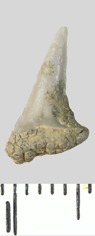 Зуб (фрагмент). Акула. Odontaspis venusta (Leriche, 1929). Классификация: Хордовые Chordata, Позвоночные Vertebrata, Хрящевые рыбы Chondrichthyes, Пластиножаберные Elasmobranchii