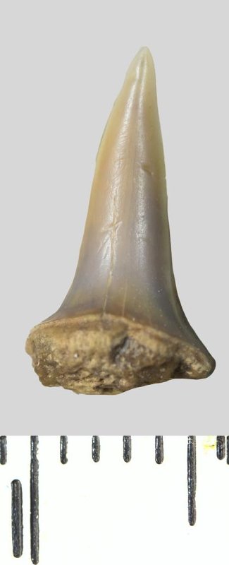 Зуб (фрагмент). Акула. Odontaspis venusta (Leriche, 1929). Классификация: Хордовые Chordata, Позвоночные Vertebrata, Хрящевые рыбы Chondrichthyes, Пластиножаберные Elasmobranchii