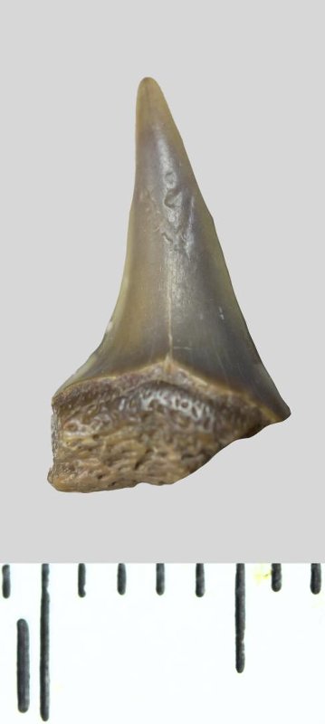 Зуб (фрагмент). Акула. Odontaspis venusta (Leriche, 1929). Классификация: Хордовые Chordata, Позвоночные Vertebrata, Хрящевые рыбы Chondrichthyes, Пластиножаберные Elasmobranchii