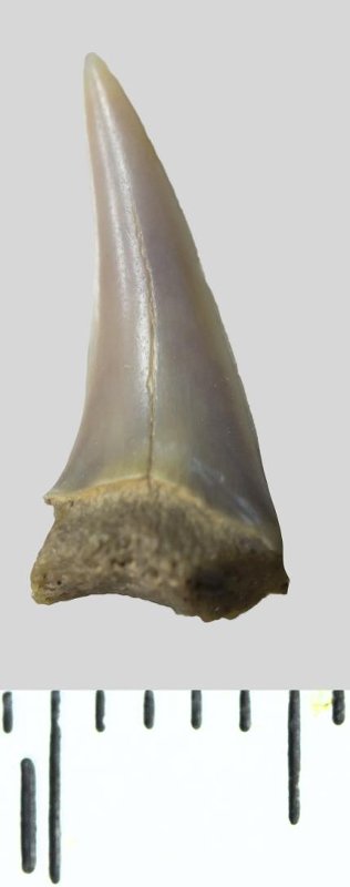 Зуб (фрагмент). Акула. Odontaspis venusta (Leriche, 1929). Классификация: Хордовые Chordata, Позвоночные Vertebrata, Хрящевые рыбы Chondrichthyes, Пластиножаберные Elasmobranchii