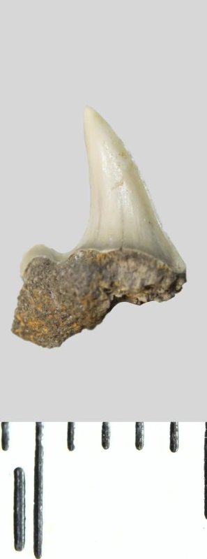 Зуб. Акула. Scapanorhynchus sp. Классификация: Хордовые Chordata, Позвоночные Vertebrata, Хрящевые рыбы Chondrichthyes, Пластиножаберные Elasmobranchii
