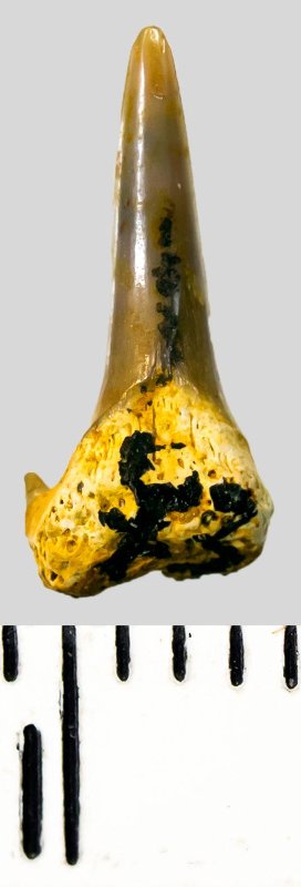 Мелкий передний (?) зуб с коронкой охристо-бежевого цвета, колюще-режущего типа, S-образно изогнутой, с гладким режущим краем. Корень светло-охристый, арочный, умеренно массивный, со следами окатанности и эрозии; утрачена правая ветвь. Имелась одна пара добавочных зубцов коронки, сохранился только левый.