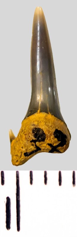 Мелкий зуб с коронкой темно-серого цвета, колюще-режущего типа, S-образно изогнутой, с гладким режущим краем. Корень темно-охристый, арочный, умеренно массивный, со следами окатанности; утрачена правая ветвь. Имелась одна пара добавочных зубцов коронки, сохранился только левый.