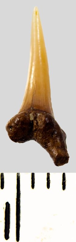Мелкий боковой зуб с коронкой рыжевато-бежевого цвета, колюще-режущего типа, S-образно изогнутой, с гладким режущим краем. С лингвальной стороны у основания коронки на эмали имеется скульптура в виде слабой продольной струйчатости. Корень бурый, арочный, умеренно массивный, со следами окатанности, левая ветвь утрачена. Имеется одна питательная борозда с лингвальной стороны корня. Добавочные зубцы коронки зуба отсутствуют.