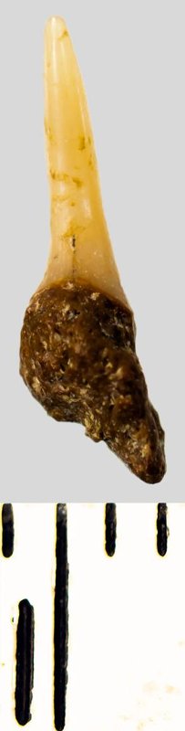 Мелкий боковой зуб с коронкой рыжевато-бежевого цвета, колюще-режущего типа, S-образно изогнутой, с гладким режущим краем. С лингвальной стороны у основания коронки на эмали имеется скульптура в виде слабой продольной струйчатости. Корень бурый, арочный, умеренно массивный, со следами окатанности, левая ветвь утрачена. Имеется одна питательная борозда с лингвальной стороны корня. Добавочные зубцы коронки зуба отсутствуют.