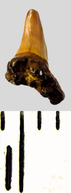 Зуб. Акула. Eostriatolamia subulata (Agassiz, 1843). Классификация: Хордовые Chordata, Позвоночные Vertebrata, Хрящевые рыбы Chondrichthyes, Пластиножаберные Elasmobranchii, Акулы Selachii, Ламнообразные Lamniformes, Песчаные акулы Odontaspididae
