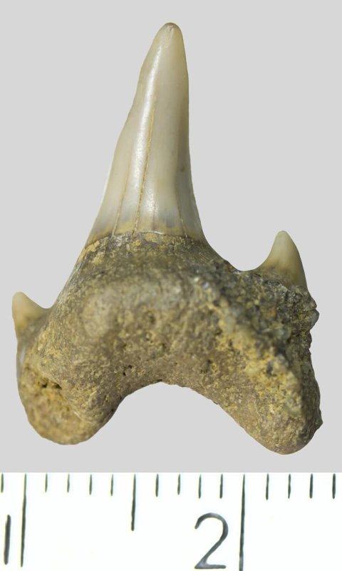Зуб. Акула. Odontaspis macrorhiza (Cope) Leriche, 1902. Классификация: Хордовые Chordata, Позвоночные Vertebrata, Хрящевые рыбы Chondrichthyes, Пластиножаберные Elasmobranchii
