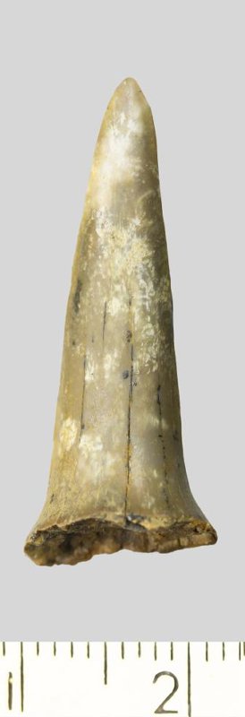 Зуб (фрагмент). Акула. Scapanorhynchus gigas Woodward, 1889. Классификация: Хордовые Chordata, Позвоночные Vertebrata, Хрящевые рыбы Chondrichthyes, Пластиножаберные Elasmobranchii