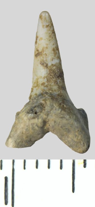 Зуб. Акула. Odontaspis angustidens (Reuss, 1845). Классификация: Хордовые Chordata, Позвоночные Vertebrata, Хрящевые рыбы Chondrichthyes, Пластиножаберные Elasmobranchii