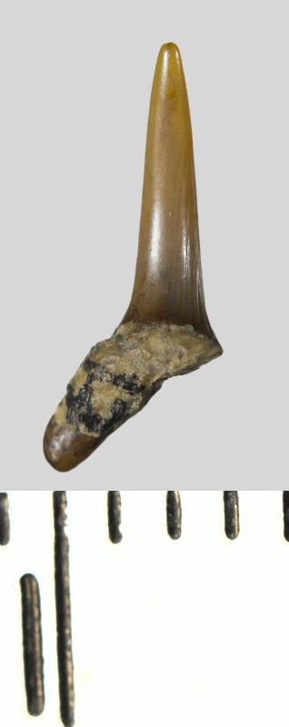 Зуб. Акула. Scapanorhynchus sp. Классификация: Хордовые Chordata, Позвоночные Vertebrata, Хрящевые рыбы Chondrichthyes, Пластиножаберные Elasmobranchii