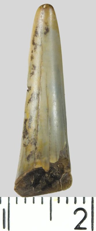 Зуб (фрагмент). Акула. Scapanorhynchus gigas Woodward, 1889. Классификация: Хордовые Chordata, Позвоночные Vertebrata, Хрящевые рыбы Chondrichthyes, Пластиножаберные Elasmobranchii