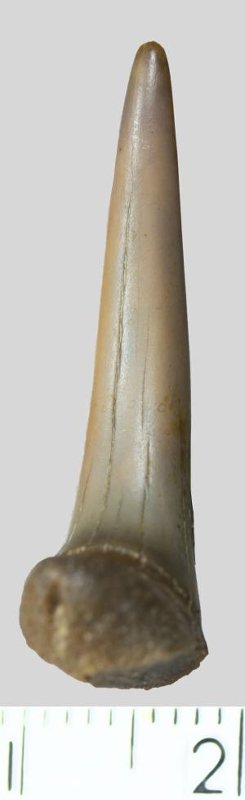 Зуб (фрагмент). Акула. Scapanorhynchus gigas Woodward, 1889. Классификация: Хордовые Chordata, Позвоночные Vertebrata, Хрящевые рыбы Chondrichthyes, Пластиножаберные Elasmobranchii