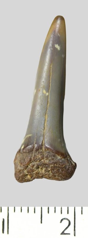 Зуб. Акула. Scapanorhynchus gigas Woodward, 1889. Классификация: Хордовые Chordata, Позвоночные Vertebrata, Хрящевые рыбы Chondrichthyes, Пластиножаберные Elasmobranchii