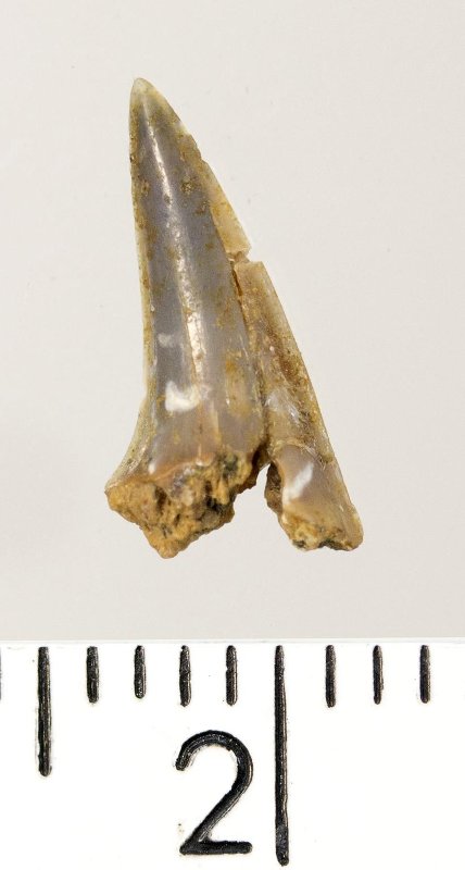 Зуб (фрагмент). Акула. Hypotodus sp. Классификация: Хордовые Chordata, Позвоночные Vertebrata, Хрящевые рыбы Chondrichthyes, Пластиножаберные Elasmobranchii