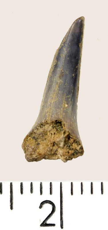 Зуб (фрагмент). Акула. Hypotodus sp. Классификация: Хордовые Chordata, Позвоночные Vertebrata, Хрящевые рыбы Chondrichthyes, Пластиножаберные Elasmobranchii