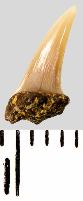 Зуб. Акула. Eostriatolamia subulata (Agassiz, 1843). Классификация: Хордовые Chordata, Позвоночные Vertebrata, Хрящевые рыбы Chondrichthyes, Пластиножаберные Elasmobranchii, Акулы Selachii, Ламнообразные Lamniformes, Песчаные акулы Odontaspididae