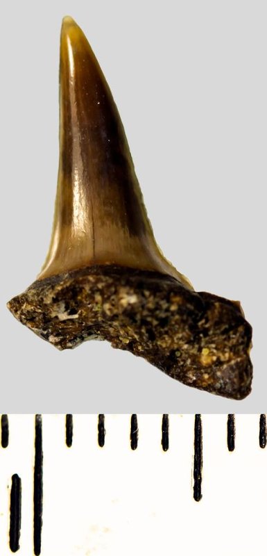 Мелкий боковой зуб с коронкой рыжевато-бежевого цвета, колюще-режущего типа, S-образно изогнутой, с гладким режущим краем. С лингвальной стороны у основания коронки на эмали имеется скульптура в виде слабой продольной струйчатости. Корень бурый, арочный, умеренно массивный, со следами окатанности, левая ветвь утрачена. Имеется одна питательная борозда с лингвальной стороны корня. Добавочные зубцы коронки зуба отсутствуют.