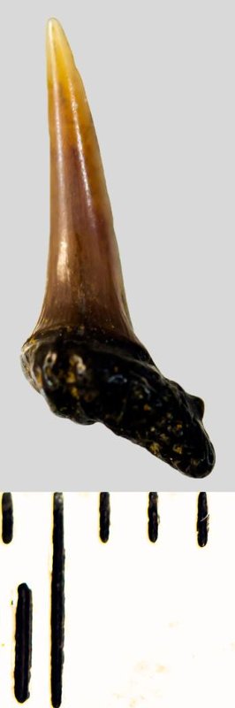 Мелкий боковой зуб с коронкой рыжевато-бежевого цвета, колюще-режущего типа, S-образно изогнутой, с гладким режущим краем. С лингвальной стороны у основания коронки на эмали имеется скульптура в виде слабой продольной струйчатости. Корень бурый, арочный, умеренно массивный, со следами окатанности, левая ветвь утрачена. Имеется одна питательная борозда с лингвальной стороны корня. Добавочные зубцы коронки зуба отсутствуют.