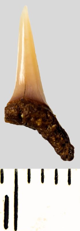 Мелкий боковой зуб с коронкой рыжевато-бежевого цвета, колюще-режущего типа, S-образно изогнутой, с гладким режущим краем. С лингвальной стороны у основания коронки на эмали имеется скульптура в виде слабой продольной струйчатости. Корень бурый, арочный, умеренно массивный, со следами окатанности, левая ветвь утрачена. Имеется одна питательная борозда с лингвальной стороны корня. Добавочные зубцы коронки зуба отсутствуют.