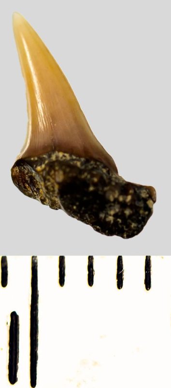 Зуб. Акула. Eostriatolamia subulata (Agassiz, 1843). Классификация: Хордовые Chordata, Позвоночные Vertebrata, Хрящевые рыбы Chondrichthyes, Пластиножаберные Elasmobranchii, Акулы Selachii, Ламнообразные Lamniformes, Песчаные акулы Odontaspididae