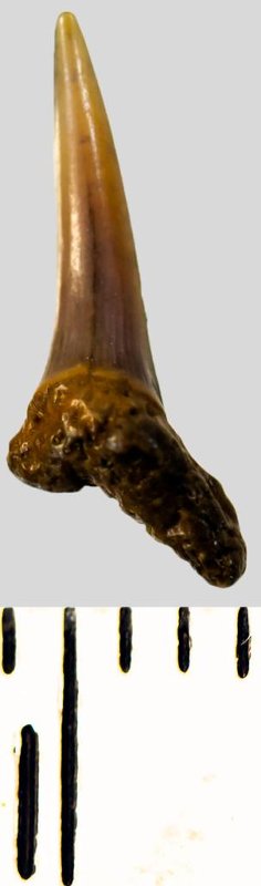 Мелкий боковой зуб с коронкой рыжевато-бежевого цвета, колюще-режущего типа, S-образно изогнутой, с гладким режущим краем. С лингвальной стороны у основания коронки на эмали имеется скульптура в виде слабой продольной струйчатости. Корень бурый, арочный, умеренно массивный, со следами окатанности, левая ветвь утрачена. Имеется одна питательная борозда с лингвальной стороны корня. Добавочные зубцы коронки зуба отсутствуют.