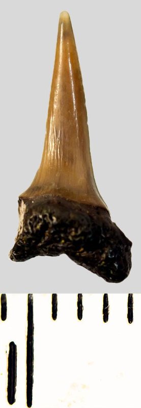 Зуб. Акула. Eostriatolamia subulata (Agassiz, 1843). Классификация: Хордовые Chordata, Позвоночные Vertebrata, Хрящевые рыбы Chondrichthyes, Пластиножаберные Elasmobranchii, Акулы Selachii, Ламнообразные Lamniformes, Песчаные акулы Odontaspididae