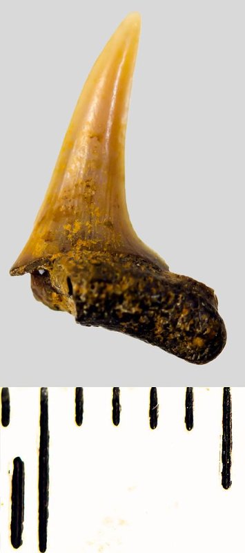 Мелкий боковой зуб с коронкой рыжевато-бежевого цвета, колюще-режущего типа, S-образно изогнутой, с гладким режущим краем. С лингвальной стороны у основания коронки на эмали имеется скульптура в виде слабой продольной струйчатости. Корень бурый, арочный, умеренно массивный, со следами окатанности, левая ветвь утрачена. Имеется одна питательная борозда с лингвальной стороны корня. Добавочные зубцы коронки зуба отсутствуют.