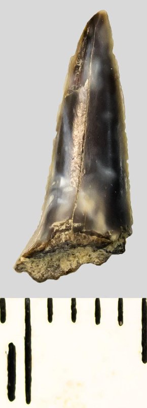 Зуб (фрагмент). Акула. Lamiostoma vincenti (Winkler, 1876). Классификация: Хордовые Chordata, Позвоночные Vertebrata, Хрящевые рыбы Chondrichthyes, Пластиножаберные Elasmobranchii