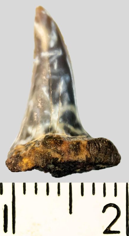 Зуб (фрагмент). Акула. Lamiostoma vincenti (Winkler, 1876). Классификация: Хордовые Chordata, Позвоночные Vertebrata, Хрящевые рыбы Chondrichthyes, Пластиножаберные Elasmobranchii