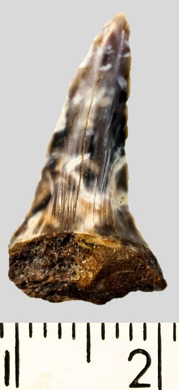 Зуб (фрагмент). Акула. Striatolamia elegans (Agassiz, 1838). Классификация: Хордовые Chordata, Позвоночные Vertebrata, Хрящевые рыбы Chondrichthyes, Пластиножаберные Elasmobranchii