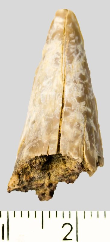 Зуб (фрагмент). Акула. Otodus subserratus (Agassiz, 1843). Классификация: Хордовые Chordata, Позвоночные Vertebrata, Хрящевые рыбы Chondrichthyes, Пластиножаберные Elasmobranchii