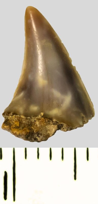 Зуб (фрагмент). Акула. Otodus subserratus (Agassiz, 1843). Классификация: Хордовые Chordata, Позвоночные Vertebrata, Хрящевые рыбы Chondrichthyes, Пластиножаберные Elasmobranchii